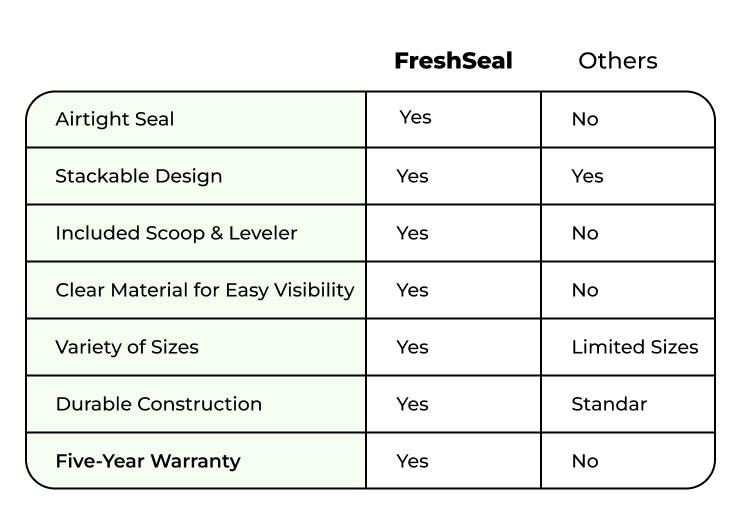 The FreshSeal Storage Set comes with a 5-year warranty, offering you peace of mind and assurance of the product's quality and durability.